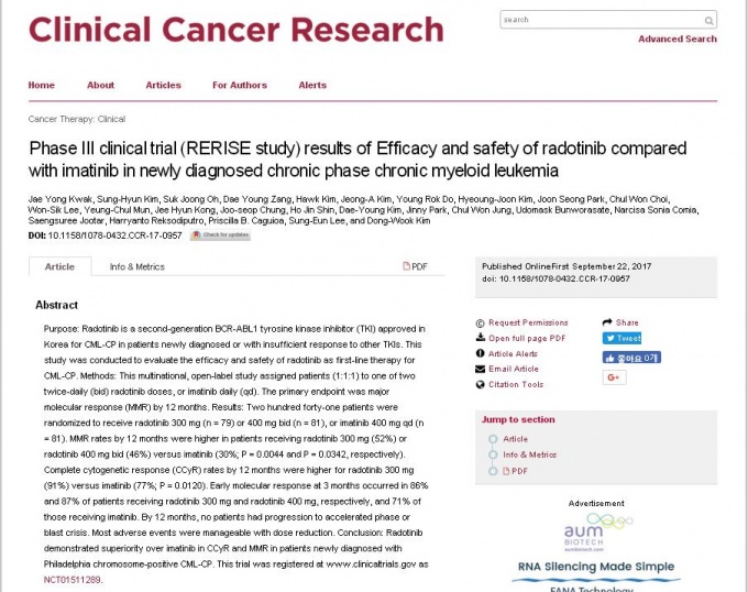 ÀϾç¾àǰÀº ÀÚ»çÀÇ ¹éÇ÷º´ ½Å¾à ‘½´ÆåÆ®(¼ººÐ¸í: ¶óµµÆ¼´Õ RADOTINIB)’ÀÇ À¯ÀüÀÚ¹ÝÀÀÀ²¿¡ ´ëÇÑ ÀÓ»ó 3»ó ¿¬±¸°á°ú°¡ ±¹Á¦ ÇмúÁö <Clinical Cancer Research>¿¡ °ÔÀçµÆ´Ù°í 26ÀÏ ¹àÇû´Ù.