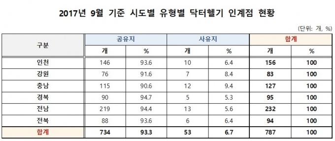 À¯Çüº°·Î º¸¸é, Àüü 787°³ ´ÚÅÍÇï±â ÀΰèÁ¡ Áß, 93.3%(734°³)°¡ °øÀ¯Áö¿´À¸¸ç, »çÀ¯Áö´Â ÀüüÀÇ 6.7%ÀÎ 53°³¿¡ ºÒ°úÇß´Ù.