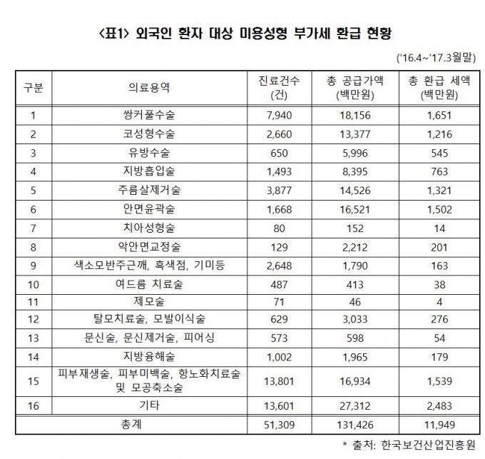 °¡Àå ¸¹ÀÌ È¯±ÞµÈ Ç׸ñÀº ÇǺÎÀç»ý¼ú·Î 1¸¸3801°ÇÀ̸ç, ½Ö²¨Ç® ¼ö¼ú 7940°Ç, ÁÖ¸§»ìÁ¦°Å¼ú 3877°Ç, ÄÚ ¼ºÇü¼ö¼ú 2660°ÇÀÌ ±× µÚ¸¦ À̾ú´Ù.