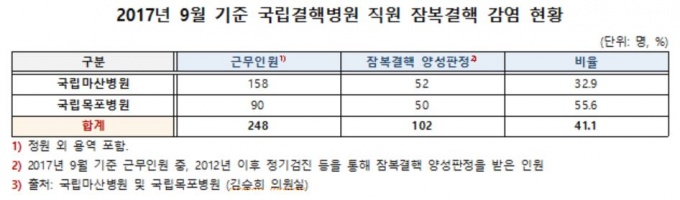 ±¹¸³¸¶»êº´¿ø ¹× ±¹¸³¸ñÆ÷º´¿ø Á¦ÃâÀÚ·á¿¡ µû¸£¸é, 2017³â 9¿ù ±âÁØ µÎ º´¿ø¿¡ ±Ù¹«ÇÏ´Â Á÷¿ø 248¸í Áß 2012³â ÀÌÈÄ Àẹ°áÇÙ ¾ç¼ºÆÇÁ¤À» ¹ÞÀº »ç¶÷ÀÌ 102¸íÀ¸·Î, ±¹¸³°áÇÙº´¿ø Á÷¿øÀÇ 41.1%°¡ Àẹ°áÇÙ¿¡ °¨¿°µÈ °ÍÀ¸·Î È®ÀεƴÙ.