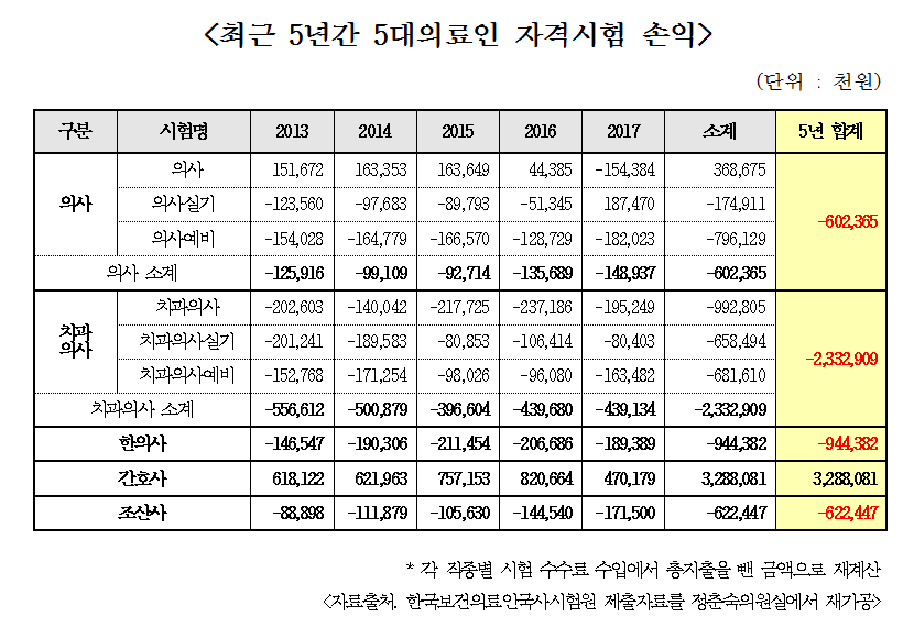 12ÀÏ Á¤Ãá¼÷ ÀÇ¿ø(±¹È¸ º¸°Çº¹ÁöÀ§¿øÈ¸ À§¿ø, ´õºÒ¾î¹ÎÁÖ´ç ºñ·Ê´ëÇ¥)ÀÌ ¹ÞÀº 5´ë ÀÇ·áÀÎ ÀڰݽÃÇè, ±³À°Á¦µµ °ü·Ã ±¹Á¤°¨»ç ÀÚ·á¿¡ µû¸£¸é ÃÖ±Ù 5³â°£ ½ÃÇè¼ö¼ö·á ´ëºñ ÁöÃâ ¼ÕÀÍÀ» °è»êÇØ º» °á°ú, 5´ë ÀÇ·áÀÎ ½ÃÇè¿¡¼ À¯ÀÏÇÏ°Ô °£È£»ç ½ÃÇè¿¡¼¸¸ ¼öÀÍÀ» ³»°í ÀÖ´Â °ÍÀ¸·Î ³ªÅ¸³µ´Ù.
