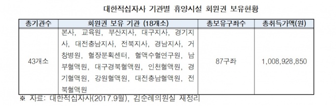 2017³â ÇöÀç ´ëÇÑÀû½ÊÀÚ»ç º»»ç¸¦ ºñ·ÔÇÑ Ç÷¾×¿ø°ú º´¿ø µî »êÇϱâ°ü 43°³¼Ò Áß 18°³¼Ò°¡ °¢°¢ ÈÞ¾ç½Ã¼³ ȸ¿ø±ÇÀ» º¸À¯Çϰí ÀÖ´Ù. ÃÑ È¸¿ø±Ç º¸À¯·®Àº 87±¸Á·Î, Ãëµæ°¡ ±âÁØ ½Ã°¡ 10¾ï900¸¸¿ø¿¡ ´ÞÇÑ´Ù.