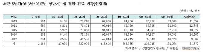 2013³âºÎÅÍ 2017³â »ó¹Ý±â±îÁö ÃÖ±Ù ¸Åµ¶, ÀÓÁú, ÀÎü¸é¿ª°áÇ̹ÙÀÌ·¯½ºº´ µî ÁÖ¿ä ¼º °ü·Ã Áúȯ(ÀÌÇÏ ¼ºº´)À¸·Î ÀÎÇØ Áø·á¸¦ ¹ÞÀº ȯÀÚ´Â 163¸¸¸íÀ» ³Ñ¾î¼¹´Ù.
