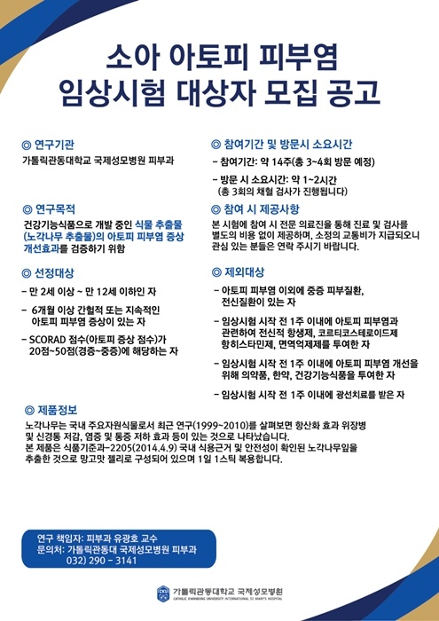 °¡Å縯°üµ¿´ëÇб³ ±¹Á¦¼º¸ðº´¿ø(º´¿øÀå ±è¿µÀÎ)Àº ¼Ò¾Æ ¾ÆÅäÇÇ ÇǺο° ȯÀÚµéÀ» ´ë»óÀ¸·Î ÀÓ»ó½ÃÇè ´ë»óÀÚ¸¦ ¸ðÁýÇÑ´Ù.