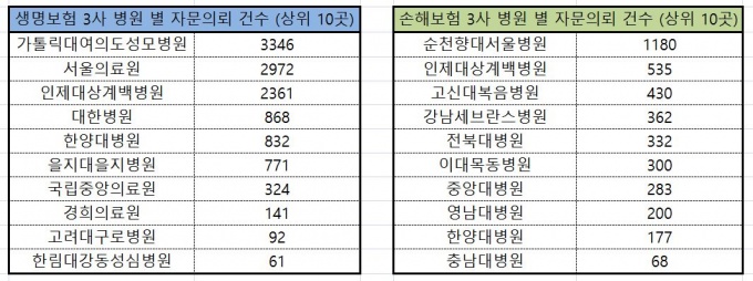 ·Ôµ¥·MG·AXA µî ¼ÕÇØº¸Çè 3»ç´Â ¼øÃµÇâ´ë¼¿ïº´¿ø 1180°Ç, ÀÎÁ¦´ë»ó°è¹éº´¿ø 535°Ç, °í½Å´ëº¹À½º´¿ø 430°Ç, °³²¼¼ºê¶õ½ºº´¿ø 362°Ç, ÀüºÏ´ëº´¿ø 332°Ç, ÀÌ´ë¸ñµ¿º´¿ø 300°Ç, Á߾Ӵ뺴¿ø 283°ÇÀÇ ¼ø¼·Î ÀÇ·áÀÚ¹®À» ÀÇ·ÚÇÑ °ÍÀ¸·Î ³ªÅ¸³µ´Ù.