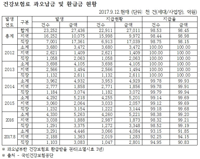 24ÀÏ ±¹È¸ º¸°Çº¹ÁöÀ§¿øÈ¸ À±Á¾ÇÊ ÀÇ¿ø(ÀÚÀ¯Çѱ¹´ç)ÀÌ °Çº¸°ø´ÜÀ¸·ÎºÎÅÍ Á¦Ãâ¹ÞÀº '2012³â~2016³â °ú¿À³³±Ý ÇöȲ'¿¡ µû¸£¸é Áö³ 5³â°£ ÃÑ 2Á¶ 2,990¾ï¿øÀÇ °ú¿À³³±ÝÀÌ ¹ß»ýÇß´Ù. ¿¬µµº° ȯ±Þ¾×Àº 2012³â 3,472¾ï, 2013³â 4,105¾ï, 2014³â 4,932¾ï, 2015³â 5,218¾ï¿ø, 2016³â 5,263¾ï¿ø µî ¸Å³â Áõ°¡Çß´Ù.