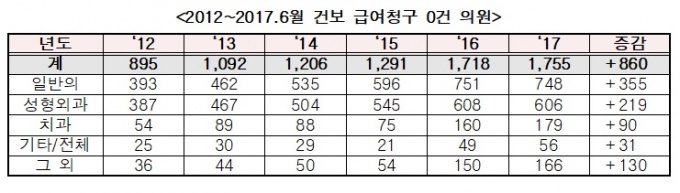 26ÀÏ °Ç°º¸Çè½É»çÆò°¡¿øÀÌ ÀÚÀ¯Çѱ¹´ç ±è»óÈÆ ÀÇ¿ø¿¡°Ô Á¦ÃâÇÑ ‘°Çº¸Ã»±¸ ºÎÀç ÀÇ¿ø ÇöȲ(2012~2017)’¿¡ µû¸£¸é, °Ç°º¸Çè ±Þ¿©Ã»±¸°¡ 0°ÇÀÎ °÷ÀÌ 2012³â 895°÷¿¡¼ ÇöÀç(2017³â 6¿ù ±âÁØ) 1755°÷À¸·Î 2¹è°¡·® Áõ°¡Çß´Ù.