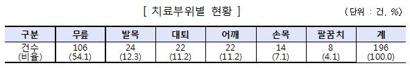 2014³â 1¿ùºÎÅÍ 2017³â 6¿ù±îÁö Çѱ¹¼ÒºñÀÚ¿ø¿¡ Á¢¼öµÈ °üÀýÁúȯ °ü·Ã ÇÇÇØ ±¸Á¦½ÅûÀº ÃÑ 196°ÇÀ̰í Ä¡·áºÎÀ§´Â ¹«¸ÀÌ 54.1%(106°Ç)·Î °¡Àå ¸¹¾ÒÀ¸¸ç ¹ß¸ñ 12.3%(24°Ç), ´ëÅð¿Í ¾î±ú°¡ °¢ 11.2%(22°Ç)·Î µÚ¸¦ À̾ú´Ù.