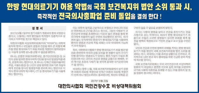 ºñ´ëÀ§´Â ±¤°í¸¦ ÅëÇØ ”Çѹæ ÀÇ·á±â±â Çã¿ë ¾Ç¹ýÀÇ ±¹È¸ º¸°Çº¹ÁöÀ§¿øÈ¸ ¹ý¾È¼ÒÀ§¿øÈ¸ Åë°ú ½Ã Áï°¢ÀûÀÎ Àü±¹ÀÇ»ç ÃÑÆÄ¾÷ Áغñ µ¹ÀÔÀ» °áÀÇÇÑ´Ù“°í ¹àÇû´Ù.