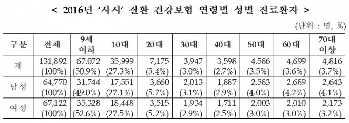 2016³â ±âÁØ ¿¬·É´ëº° Áø·áÇöȲÀ» »ìÆìº¸¸é, 9¼¼ ÀÌÇÏ(6¸¸7000¸í)°¡ °¡Àå ¸¹¾Ò°í, ±× ´ÙÀ½ 10´ë(3¸¸6000¸í), 20´ë(7000¸í) ¼øÀ¸·Î ³ªÅ¸³µ´Ù. ƯÈ÷ 9¼¼ ÀÌÇÏ ¼Ò¾Æ·¾Æµ¿Àº Àüü ȯÀÚÀÇ 51%¸¦ Â÷ÁöÇß´Ù.