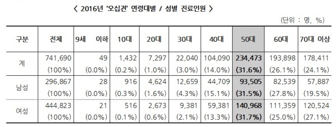 ÅðÇ༺ ÁúȯÀ¸·Î ¾Ë·ÁÁø ¿À½Ê°ßÀº ȯÀÚ 10¸í Áß 8¸íÀÌ 50´ë ÀÌ»óÀÎ °ÍÀ¸·Î ³ªÅ¸³µ´Ù. Àüü ȯÀÚ ¼ö´Â ÁÙ¾úÁö¸¸ ¼ö¼úÀÌ ¸¹¾ÆÁö¸é¼ Áø·áºñ´Â Áõ°¡¼¼¸¦ º¸À̰í ÀÖ´Ù