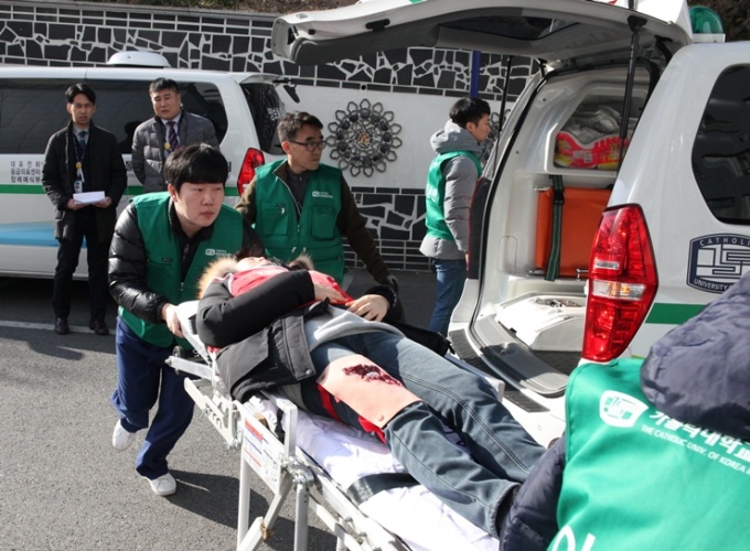 ¸ðÀÇÈÆ·ÃÀº ÀÎõ¼º¸ðº´¿ø ÀÇ·áÁø, ÀÀ±Þ±¸Á¶»ç, ¾à»ç, ÇàÁ¤Á÷¿ø µî 70¿© ¸íÀÌ Âü¿©Çß°í Àç³»óȲ ¹ß»ý º¸°í¿Í µ¿½Ã¿¡ º°°ü ¾Õ¿¡ Àӽà Á¾ÇÕ»óȲ½Ç, ÀÀ±ÞÀÇ·áÆÀ, ÀÌ¼ÛÆÀ µîÀÌ ±¸¼ºµÆ´Ù.