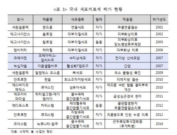 ÀÌ¾î ±×´Â "¼¼Æ÷Ä¡·áÁ¦ Çã°¡ °Ç¼ö·Î º¸¸é ÇØ¿Ü¿¡ ºñÇØ ±¹³»°¡ ´õ ¸¹Àº ÆíÀÌÁö¸¸, ´ëºÎºÐ À¯ÀüÀÚÀçÁ¶ÇÕÀÌ ÇÊ¿ä ¾ø´Â ºñ±³Àû °£´ÜÇÑ ÇüÅÂ"¶ó¸ç "÷´Ü ±â¼úÀ» Ȱ¿ëÇÑ ¼¼Æ÷Ä¡·áÁ¦ °æ¿ì´Â ¼±Áø±¹ÀÌ ÁÖµµÇϰí ÀÖ°í ±¹³»´Â ±âÃÊ¿¬±¸ ´Ü°è¿¡ ÀÖ´Ù"°í µ¡ºÙ¿´´Ù. |