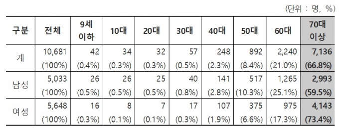 2016³â ±âÁØ ¿¬·É´ëº° Áø·áÇöȲÀ» »ìÆìº¸¸é, 70´ë ÀÌ»ó(7136¸í, 66.8%)ÀÌ °¡Àå ¸¹¾Ò°í, ±× ´ÙÀ½ 60´ë(2240¸í, 21%), 50´ë(892¸í, 8.4%) ¼øÀ¸·Î ³ªÅ¸³µ´Ù.
