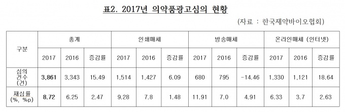 Çѱ¹Á¦¾à¹ÙÀÌ¿ÀÇùȸ ÀǾàǰ±¤°í½ÉÀÇÀ§¿øÈ¸(À§¿øÀå Á¤ÀçÈÆ)°¡ ¹ßÇ¥ÇÑ 2017 ÀǾàǰ ±¤°í½ÉÀÇ ÇöȲ¿¡ µû¸£¸é ¿ÃÇØ ÀǾàǰ±¤°í½ÉÀǰǼö´Â ÃÑ 3861°ÇÀ¸·Î, ÀÌ´Â Áö³ÇØ 3343°Çº¸´Ù 518°Ç Áõ°¡ÇÑ ¼öÄ¡´Ù.