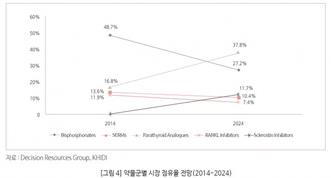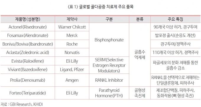 ÇöÀç ½ÃÀåÀÇ Àý¹Ý °¡±îÀÌ Â÷ÁöÇϰí ÀÖ´Â °ñÈí¼ö ¾ïÁ¦Á¦(ºñ½ºÆ÷½ºÆ÷³×ÀÌÆ®, SERMs, RANKLÀúÇØÁ¦ µî)ÀÇ ¿µÇâ·ÂÀº Á¡Â÷ ¾àȵǴ ¹Ý¸é, °ñÇü¼ºÀ» ÃËÁøÇÏ´Â ½Å±Ô Ä¡·áÁ¦´Â °ÈµÈ´Ù.