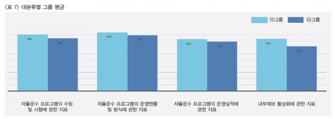 ÀÚÀ²Áؼö ÇÁ·Î±×·¥ ¼ö¸³ ¹× ½ÃÇà °ü·Ã ÁöÇ¥ÀÇ °æ¿ì °¢°¢ 4.53Á¡, 4.24Á¡ÀÌ¸ç µÎ ±×·ìÀÇ Â÷À̰¡ 0.29Á¡ÀÎ °Í°ú ºñ±³Çϸé 2¹è Á¤µµ ³ôÀº ¼öÄ¡´Ù.