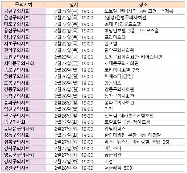 °¢ ±¸ ÀÇ»çȸ¿¡ µû¸£¸é 2¿ù21ÀÏ ±Ýõ±¸ÀÇ»çȸ°¡ Á¦24Â÷ Á¤±âÃÑȸ·Î ù Å×ÀÌÇÁ¸¦ ²÷´Â´Ù. À̾î 22ÀÏ ÀºÆò±¸ÀÇ»çȸ, ¸¶Æ÷±¸ÀÇ»çȸ, ¿ë»ê±¸ÀÇ»çȸ, °³²±¸ÀÇ»çȸ, ¼Ãʱ¸ÀÇ»çȸ, °ü¾Ç±¸ÀÇ»çȸ Á¤ÃÑÀÌ ¿¸°´Ù.