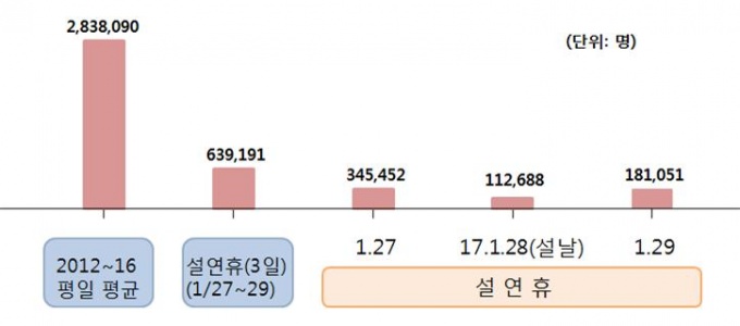 ¿¬ÈÞ ±â°£ ÀϺ° ȯÀÚ¼ö´Â ¼³ Àü³¯ÀÌ 34¸¸5452¸íÀ¸·Î °¡Àå ¸¹¾Ò°í ¼³ ´ÙÀ½³¯ÀÌ 18¸¸1051¸í, ¸íÀý ´çÀÏÀÌ 11¸¸2688¸í ¼øÀ̾ú´Ù.