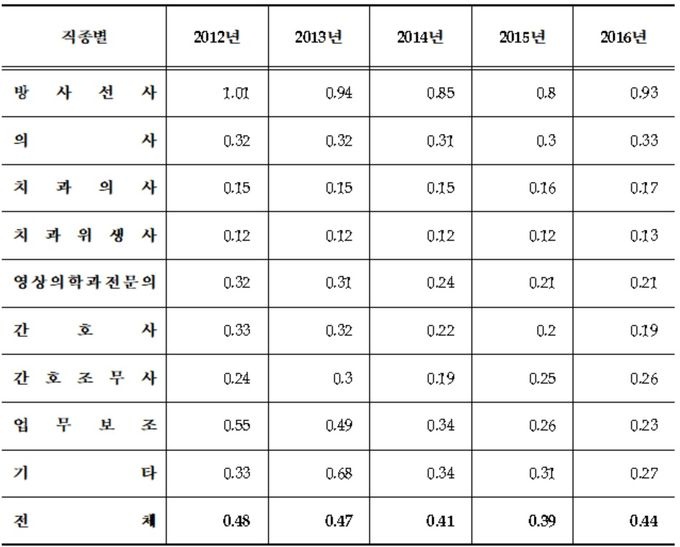Á÷Á¾º°·Î »ìÆìº¸¸é ¹æ»ç¼±»ç°¡ 0.93mSv·Î °¡Àå ³ôÀº ¼±·®À» ³ªÅ¸³Â°í, Àǻ簡 0.33mSv·Î µÚ¸¦ À̾ú´Ù. °£È£Á¶¹«»ç 0.26mSv, °£È£»ç 0.19mSv, Ä¡°úÀÇ»ç 0.17mSv ¼øÀ̾ú´Ù.