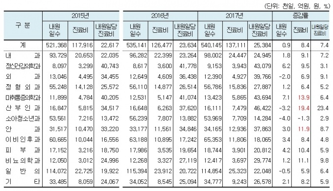 °¡Àå Å« ¹üÀ§¸¦ Â÷ÁöÇÏ´Â ÀÇ¿øÀÇ Áø·áºñ¸¦ ¼¼ºÎÀûÀ¸·Î ÆÄ¾ÇÇØº¸¸é, »êºÎÀΰúÀÇ Áø·áºñ Áõ°¡À²ÀÌ µµµå¶óÁ³´Ù. 2016³â 6263¾ï¿ø¿¡¼ 2017³â 7479¾ï¿øÀ¸·Î 19.4%ÀÇ Áõ°¡¼¼¸¦ º¸¿´´Ù.