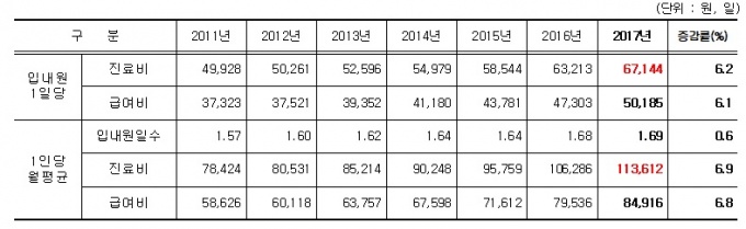 ¶Ç ´Ã¾î³ª´Â ½É»çÁø·áºñ È帧¿¡ ¸ÂÃç ÀÔ³»¿ø 1ÀÏ ´ç Áø·áºñ´Â 6¸¸7144¿øÀ¸·Î Áý°èµÆ´Ù. ÀÌ´Â 2016³â ´ëºñ 6.2%·Î Áõ°¡ÇÑ ¼öÄ¡´Ù. ¶Ç 1ÀÎ ´ç ¿ùÆò±Õ Áø·áºñ 11¸¸3612¿øÀ¸·Î 6.9% ´Ã¾î³µ´Ù