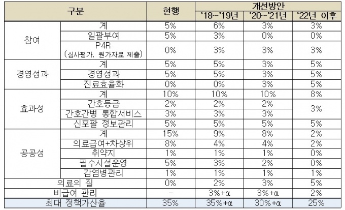 ½ÉÆò¿øÀÌ Á¦½ÃÇÑ ½ÅÆ÷°ý¼ö°¡Á¦ Á¤Ã¥°¡»ê ¼¼ºÎÁöÇ¥(2018~2019³â, µµÀÔ±â)¸¦ »ìÆìº¸¸é, ¡ãÂü¿© 6% ¡ã°æ¿µ¼º°ú 5% ¡ãÈ¿°ú¼º 10% ¡ã°ø°ø¼º 9% ¡ãÀÇ·áÁú 2% ¡ãºñ±Þ¿© °ü¸® 3%+α µîÀ¸·Î ±¸¼ºµÆ´Ù.