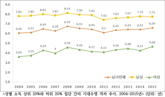 ¼¼ºÎÀûÀ¸·Î´Â ³²¼ºÀÇ ¼Òµæ¼öÁØ °£ ±â´ë¼ö¸í °ÝÂ÷°¡ 7.75³â, ¿©¼ºÀº 4.68³âÀ¸·Î °ø°³µÅ ³²³à °£ Â÷À̸¦ º¸¿´´Ù.