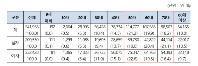 ƯÈ÷ ³²ÀÚ´Â 70´ë°¡ 4¸¸4114¸í(21.1%)À¸·Î °¡Àå ¸¹¾Ò°í, ¿©ÀÚ´Â 50´ë°¡ 7¸¸5047¸í(22.6%)À¸·Î °¡Àå ¸¹Àº ¹üÀ§¸¦ Â÷ÁöÇß´Ù.
