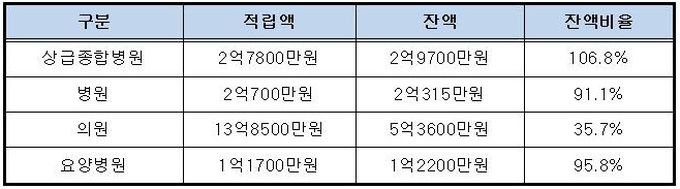 »ó±ÞÁ¾ÇÕº´¿øÀÇ °æ¿ì 2¾ï7800¸¸¿øÀÇ Àû¸³¾×¿¡ ÀÌÀÚ 1800¸¸¿ø±îÁö ÇÕ»êÇϸé Àû¸³¸ñÇ¥¾× ´ëºñ Àܾ׺ñÀ²Àº 106.8%·Î ³Ë³ËÇÑ ÆíÀÌ´Ù. º´¿ø±Þ ÀÇ·á±â°ü°ú ¿ä¾çº´¿øÀÇ Àܾ׺ñÀ² ¿ª½Ã 91.1%¿Í 95.8%¸¦ ±â·Ï ÁßÀÌ´Ù.