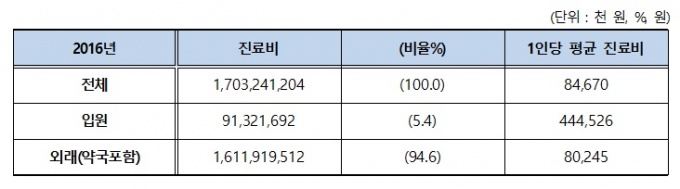2016³â ÇÑ ÇØ µ¿¾È °¨±â·Î ÁöÃâµÈ 1Àδç Áø·áºñ´Â 8¸¸4000¿øÀ¸·Î Áý°èµÆ´Ù. ¿Ü·¡Áø·á¸¦ ¹ÞÀº °æ¿ì¿¡´Â 1Àδç 8¸¸¿ø(¾à±¹Æ÷ÇÔ), ÀÔ¿øÀ» ÇÑ °æ¿ì¿¡´Â 1Àδç 44¸¸4000¿øÀ» Áø·áºñ·Î ÁöÃâÇß´Ù.