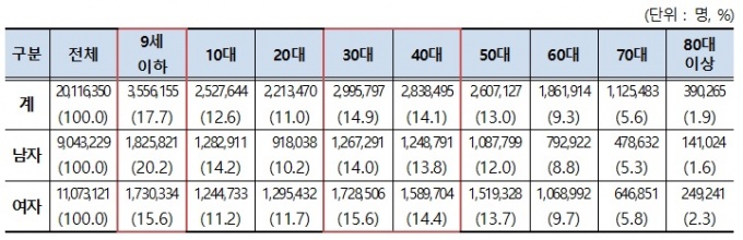 ¿¬·É´ëº°·Î ±¸ºÐÇÒ °æ¿ì, 9¼¼ ÀÌÇÏ ¾Æµ¿ÀÌ 355¸¸6155¸í(17.7%)·Î °¡Àå ¸¹¾Ò°í 30´ë°¡ 299¸¸5797¸í(14.9%), 40´ë°¡ 283¸¸8495¸í(14.1%) ¼øÀ¸·Î Áý°èµÆ´Ù.