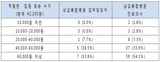 ½ÇÁ¦ ½Ã¹ü»ç¾÷ Æò°¡°á°ú, ¾÷¹«´ã´çÀÚ¿Í Áø·áÀÇ»ç ¸ðµÎ 4¸¸ 2200¿øÀ¸·Î Ã¥Á¤µÈ ÀÔ¿ø ȸ¼Û¼ö°¡´Â ‘ºÎÁ·ÇÏ´Ù’°í ´äÇß´Ù. ÀûÀýÇÑ ¼ö°¡·Î´Â 6¸¸¿ø ÀÌ»óÀÌ 54.1%·Î °¡Àå ¸¹¾Ò´Ù.