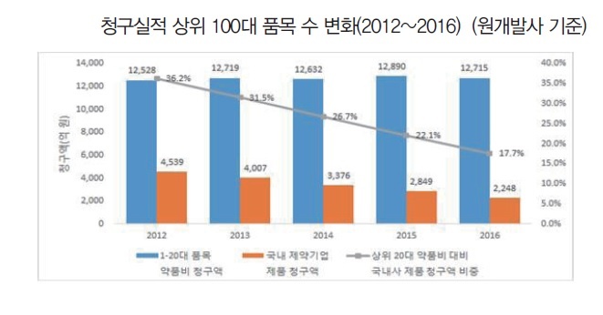 »óÀ§ 100´ë ǰ¸ñ °¡¿îµ¥ ±¹³» Á¦¾à»ç Á¦Ç°Àº 43°³(2012³â)¿¡¼ 41°³(2016³â)·Î, »óÀ§ 100´ë ±¹³» Á¦¾à±â¾÷ Á¦Ç°ÀÇ Ã»±¸¾×Àº °°Àº ±â°£ 1Á¶ 3037¾ï¿ø¿¡¼ 1Á¶ 1502¾ï¿øÀ¸·Î ¼ÒÆø Ãà¼ÒÇß´Ù.