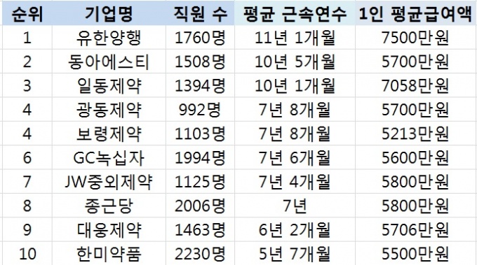 ¸ÅÃâ »óÀ§ 10´ë Á¦¾à»ç Áß Á÷¿øÀÇ ±Ù¼Ó¿¬¼ö°¡ °¡Àå ªÀº ȸ»ç´Â 'Çѹ̾àǰ'À̾ú´Ù. Çѹ̾àǰÀÇ Æò±Õ ±Ù¼Ó¿¬¼ö´Â 5³â 7°³¿ù·Î, ³²¼º(5³â 8°³¿ù)°ú ¿©¼º(5³â 6°³¿ù)ÀÌ ºñ½ÁÇß´Ù.