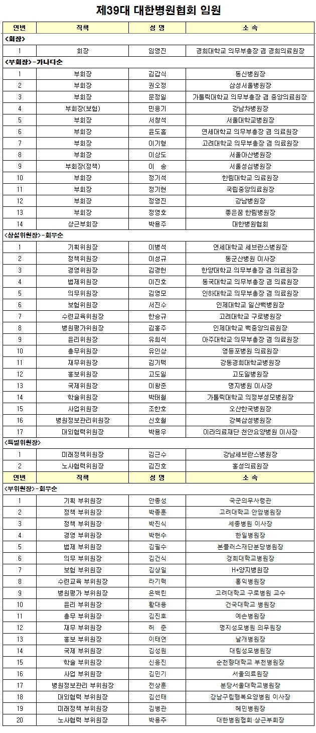 ¾ÕÀ¸·Î 2³â °£ ÀÓ¿µÁø ȸÀå°ú ÇÔ²² ´ëÇѺ´¿øÇùȸ¸¦ À̲ø¾î°¥ ÀÓ¿øÁø ¸í´ÜÀÌ È®Á¤µÆ´Ù. ´ëÇѺ´¿øÇùȸ(ȸÀå ÀÓ¿µÁø)´Â 1ÀÏ 50¿© ¸íÀÇ ºÎȸÀå ¹× À§¿øÀå, ºÎÀ§¿øÀå µî ÁýÇàºÎ ¸í´ÜÀ» °ø°³Çß´Ù.