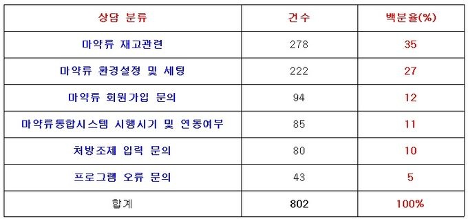 ºÐ¼®°á°ú ¸¶¾à·ù ‘Àç°í·® ÆÄ¾Ç°ú ÀÔ·Â’¿¡ ´ëÇÑ ¹®Àǰ¡ 278°ÇÀ¸·Î, Àüü 35%¸¦ Â÷ÁöÇØ °¡Àå ¸¹¾Ò´Ù.