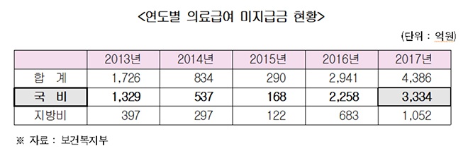º¸°Çº¹ÁöºÎ°¡ ³²Àμø ÀÇ¿ø¿¡°Ô Á¦ÃâÇÑ '¿¬µµº° ÀÇ·á±Þ¿© ¹ÌÁö±Þ±Ý ÇöȲ'¿¡ µû¸£¸é ±¹ºñ ±âÁØ ¹ÌÁö±Þ±ÝÀº 2013³â 1329¾ï¿ø¿¡¼ 2015³â 168¾ï¿øÀ¸·Î °¨¼Ò Ãß¼¼¸¦ º¸ÀÌ´Ù°¡ 2016³â 2258¾ï¿ø, 2017³â 3334¾ï¿ø µîÀ¸·Î Áõ°¡