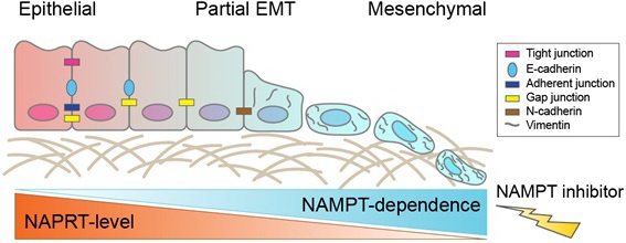 Ž»ö°á°ú¿¡ µû¸£¸é NamPT ±â´ÉÀ» ¾ïÁ¦ÇÏ´Â FK866Àº ÇÕ¼ºÄ¡»ç(Synthetic lethality) ±âÀüÀ» NAPRTÈ¿¼Ò ¹ßÇöÀÌ ¾ïÁ¦µÈ EMT ºÐÀÚ¾ÆÇü À§¾Ï µî¿¡¼ ¼±ÅÃÀûÀ¸·Î Ç×¾ÏÈ¿°ú¸¦ º¸¿´´Ù. NamPT¿Í NAPRT´Â ¼¼Æ÷ »ýÁ¸¿¡ ÇÊ¿äÇÑ ¿¡³ÊÁö¸¦ ¸¸µå´Âµ¥ ÇʼöÀûÀÎ NADÀÇ »ýÇÕ¼º¿¡ »óÈ£ º¸¿ÏÇÏ´Â È¿¼Ò´Ù.