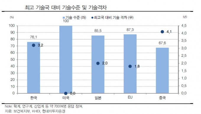 8ÀÏ Çö´ëÂ÷ÅõÀÚÁõ±Ç º¸°í¼¿¡ µû¸£¸é º¸°Çº¹ÁöºÎ°¡ ÁøÇàÇÑ 'º¸°ÇÀÇ·á·»ê¾÷ ±â¼ú¼öÁØÁ¶»ç' °á°ú ¹Ì±¹(100%)°ú EU, ÀϺ»ÀÇ ±â¼ú°ÝÂ÷´Â 87.3%, 85.5%, Çѱ¹ 76.1%, Áß±¹ 67.6% Â÷À̳ª´Â °ÍÀ¸·Î Á¶»çµÆ´Ù.