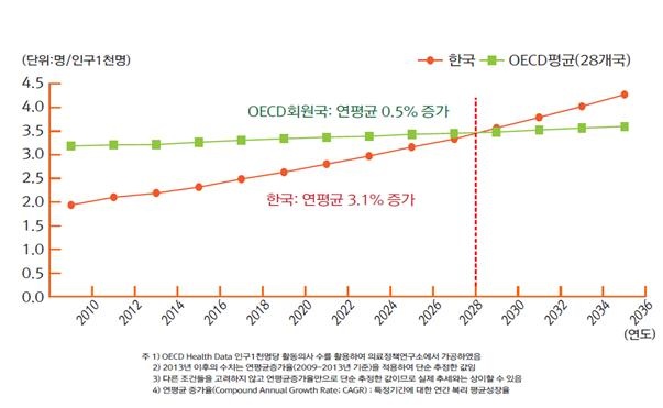 ÀÇÇùÀº “Àα¸ 1000¸í´ç Ȱµ¿ ÀÇ»ç¼öÀÇ ¿¬Æò±Õ Áõ°¡À²Àº 3.1%·Î, OECD Æò±ÕÀÎ 0.5%º¸´Ù ³ô´Ù”¸ç “2028³â ÀÌÈÄ ¿ì¸®³ª¶ó Àα¸ 1000¸í´ç Ȱµ¿ ÀÇ»ç¼ö´Â OECD Æò±ÕÀ» ÈξÀ »óȸÇÒ °Í”À̶ó°í ºÐ¼®Çß´Ù.