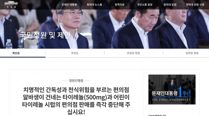 ‘ŸÀÌ·¹³î 500mg’, ‘¾î¸°ÀÌ Å¸ÀÌ·¹³î ½Ã·´’ÀÇ ÆíÀÇÁ¡ ÆÇ¸Å¸¦ Áß´ÜÀ» ¿ä±¸ÇÏ´Â ÇØ´ç û¿øÀº Áö³ 13ÀÏ ½ÃÀÛµÈ ÀÌÈÄ 5ÀÏ ¸¸ÀÎ ¿À´Ã(18ÀÏ) ¿ÀÀü 11½Ã ÇöÀç 3655¸íÀÌ Âü¿©, Å« °ü½ÉÀ» ¹Þ°í ÀÖ´Ù.