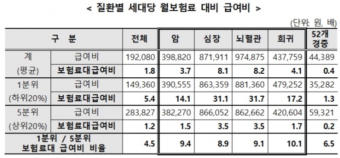 º¸Çè·á ÇÏÀ§ 20% ¼¼´ëÀÇ ¾ÏÁúȯ º¸Çè·á ´ëºñ ±Þ¿©ºñ´Â 14.1¹èÀÌ°í º¸Çè·á »óÀ§ 20% ¼¼´ë´Â 1.5¹è·Î Àú¼Òµæ ÁßÁõÁúȯÀϼö·Ï ´õ ¸¹Àº ÇýÅÃÀ¸·Î º¸´Â °ÍÀ¸·Î È®ÀεƴÙ.