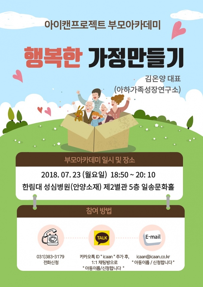 ¾ÆÀÌĵ ºÎ¸ð¾ÆÄ«µ¥¹Ì´Â ´©±¸³ª ¹«·á·Î Âü¿©ÇÒ ¼ö ÀÖ´Ù. Âü°¡ ½Åû ¹× ¹®ÀÇ´Â ÇѸ²´ëÇб³¼º½Éº´¿ø ¾ÆÀÌĵ »ç¹«±¹(031-383-3179)À¸·Î ¿¬¶ôÇÏ¸é µÈ´Ù. |