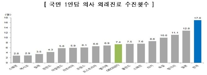±×·¯³ª ±¹¹Î 1¸íÀÌ Àǻ翡°Ô ¿Ü·¡Áø·á¸¦ ¹ÞÀº Ƚ¼ö´Â ¿¬°£ 17.0ȸ·Î OECD ȸ¿ø±¹ Áß °¡Àå ¸¹¾Ò´Ù. ȸ¿ø±¹ Æò±ÕÀÌ 7.4ȸÀÎ Á¡À» °¨¾ÈÇϸé 2¹è ÀÌ»ó ³ôÀº ¼öÁØÀÌ´Ù.
