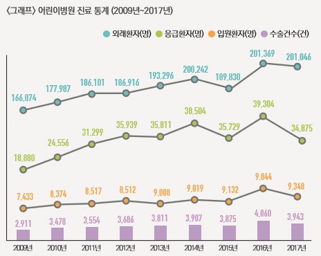 ÀÇ·áÁø È®º¸¸¦ ºñ·ÔÇØ Çϵå¿þ¾î ±¸Ãà¿¡ ÈûÀ» ½ñ¾Ò°í ´Ù°¢ÀûÀÎ ³ë·ÂÀ» ÅëÇØ Áö³ÇØ ¼¿ï¾Æ»êº´¿ø ¾î¸°À̺´¿øÀ» ãÀº ȯ¾Æ´Â ¿Ü·¡ 20¸¸1046¸íÀ¸·Î Áý°èµÆ´Ù. À̸¦ ±¸ºÐÇϸé ÀÔ¿ø 9348¸í, ÀÀ±Þ 3¸¸4875¸í µîÀÌ´Ù.