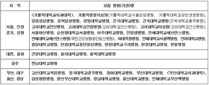 Á߾Ӵ뺴¿ø(15¸í), ¼øÃµÇâ´ëÇб³¼¿ïº´¿ø(15¸í), ¾ÆÁÖ´ëÇб³º´¿ø(14¸í) °µ¿¼º½Éº´¿ø(12¸í), ÇѾç´ëÇб³º´¿ø(11¸í) µîµµ 10¸í ÀÌ»óÀÇ ·¹Áö´øÆ® »ó±ÞÀÚ¸¦ ¼±¹ßÇÒ ¿¹Á¤ÀÌ´Ù.