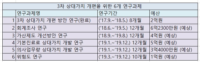 ¡ã3Â÷ »ó´ë°¡Ä¡ °³Æí ¹æ¾È(‘17.9~’18.5) ¡ãȸ°èÁ¶»ç ¿¬±¸(‘18.6.~’19.5.) ¡ãÁ¾º°±â´É Á¤»óÈ ¹× ÀÇ·áÀü´Þü°è È®¸³À» À§ÇÑ °¡»êÁ¦µµ °³¼±¹æ¾È(‘18.9.~’19.8.) ¡ã±âº»Áø·á·á »ó´ë°¡Ä¡ °³¹ß(‘19.1.~’19.12.) ¡ãÀÇ»ç¾÷¹«·® »ó´ë°¡Ä¡ °³¹ß(‘19.1.~’19.12.) ¡ãÀ§Çèµµ ¿¬±¸(‘19.3.~’19.12.) µî ¸±·¹ÀÌ ¿¬±¸°¡ ÇÙ½ÉÀÌ µÉ Àü¸ÁÀÌ´Ù.