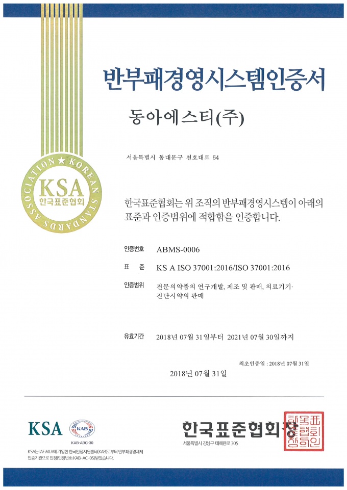 [µ¥Àϸ®¸Þµð ¾çº¸Çý ±âÀÚ] µ¿¾Æ¿¡½ºÆ¼(´ëÇ¥ÀÌ»ç ȸÀå ¾ö´ë½Ä)´Â Çѱ¹Ç¥ÁØÇùȸ(KSA)·ÎºÎÅÍ ºÎÆÐ¹æÁö°æ¿µ½Ã½ºÅÛ ‘ISO 37001’ ÀÎÁõÀ» ¹Þ¾Ò´Ù°í 31ÀÏ ¹àÇû´Ù.