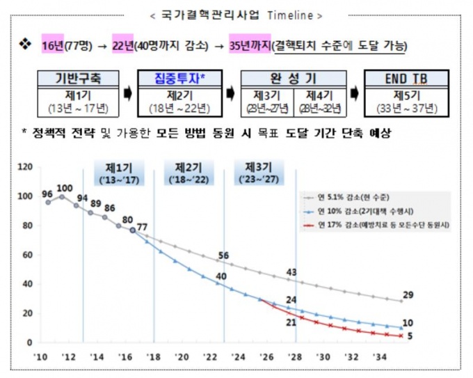 Áúº´°ü¸®º»ºÎ´Â À̸¦ ÅëÇØ 2022³â±îÁö °áÇÙ ¹ß»ý·üÀ» ÇöÀç(10¸¸¸í ´ç 77¸í)ÀÇ Àý¹Ý ¼öÁØ(40¸í)À¸·Î ³·Ãß´Â °ÍÀ» ¸ñÇ¥·Î ÇÏ¸ç ³ª¾Æ°¡ 2035³â¿¡´Â °áÇÙÅðÄ¡ ¼öÁØ(10¸í ÀÌÇÏ)±îÁö °¨¼Ò½ÃŰ°Ú´Ù´Â °èȹÀÌ´Ù.